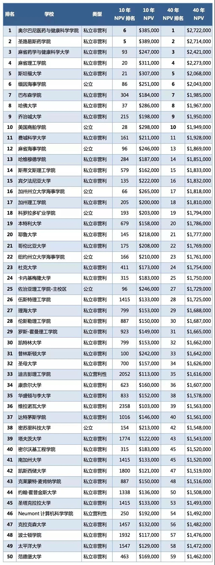 40年NPV最高的前50所大學(xué)