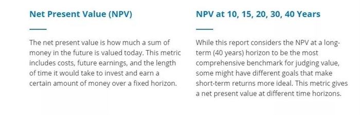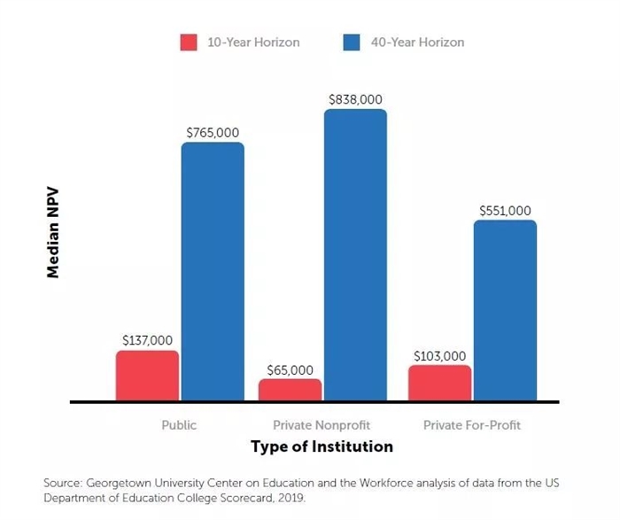 研究中使用了投資理論中的凈現(xiàn)值(netpresent value,簡(jiǎn)稱(chēng)NPV),來(lái)計(jì)算學(xué)生入學(xué)后的10、15、20、30、40年究竟能產(chǎn)生多少收益。