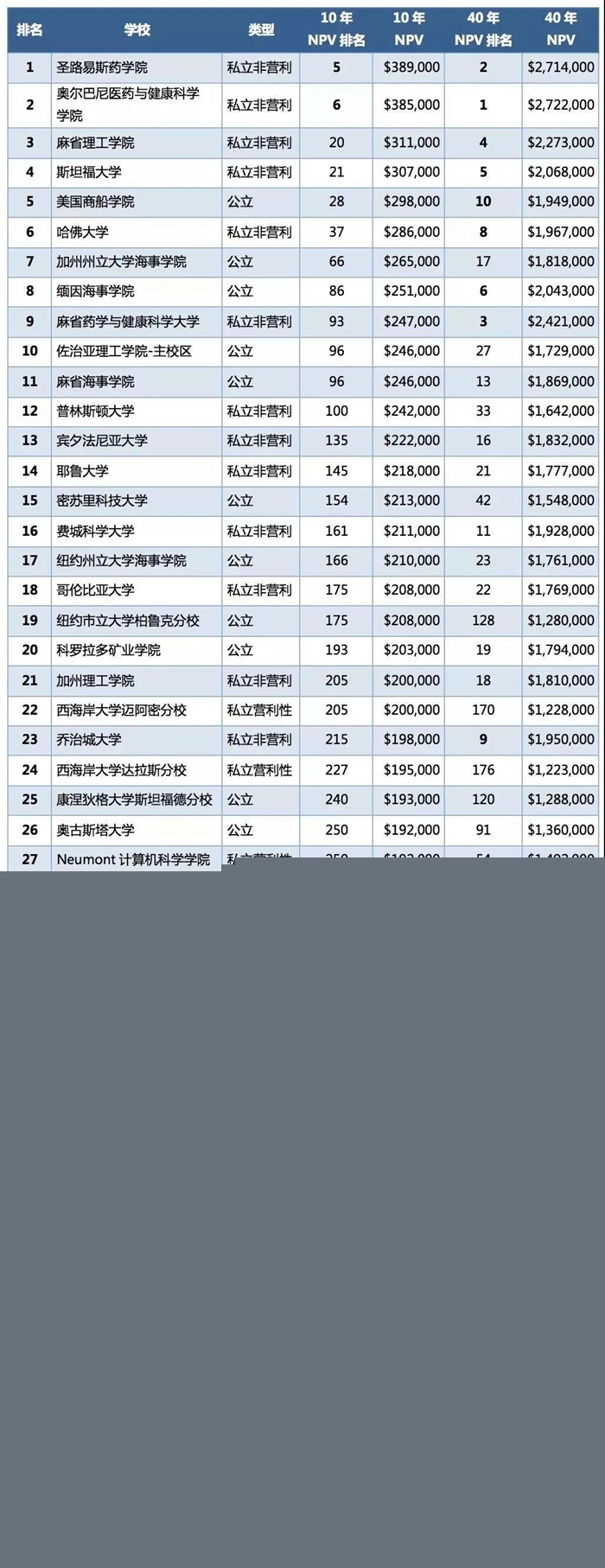 40年NPV最高的前50所大學(xué)